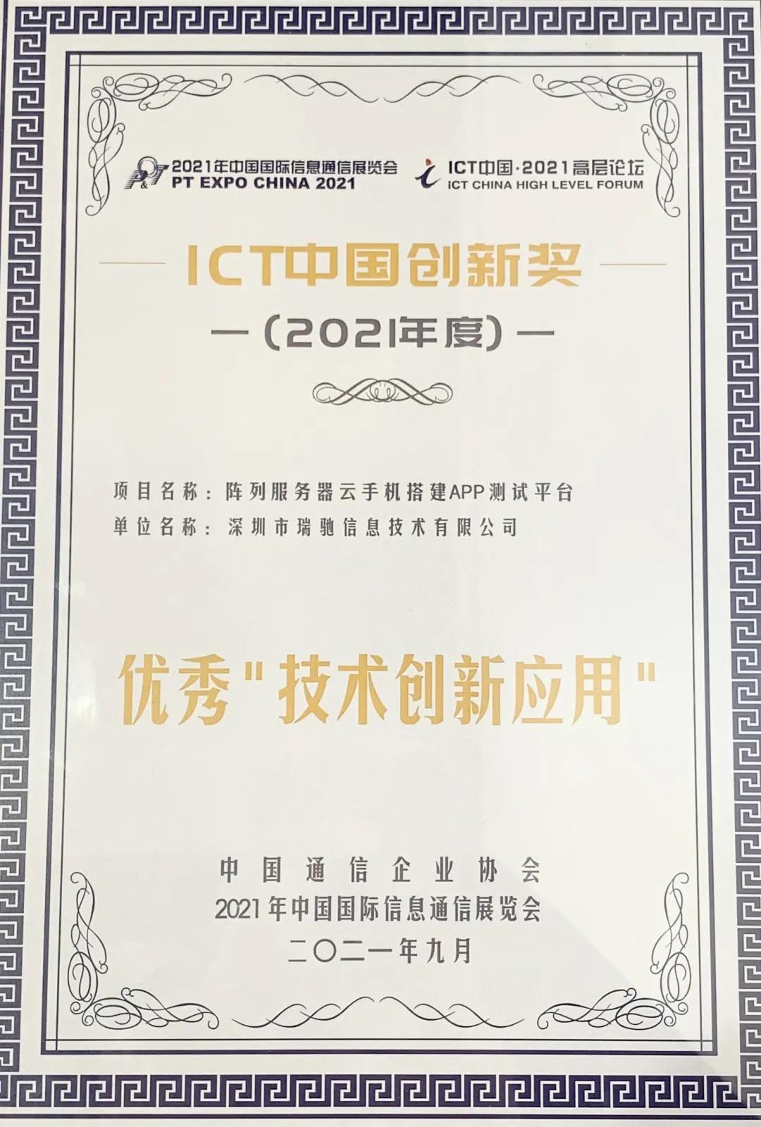 同時(shí),陣列式服務(wù)器云手機(jī)搭建APP測(cè)試平臺(tái)項(xiàng)目,榮獲2021年度ICT中國(guó)創(chuàng)新獎(jiǎng),被評(píng)為優(yōu)秀“技術(shù)創(chuàng)新應(yīng)用”,得到業(yè)界的高度認(rèn)可。