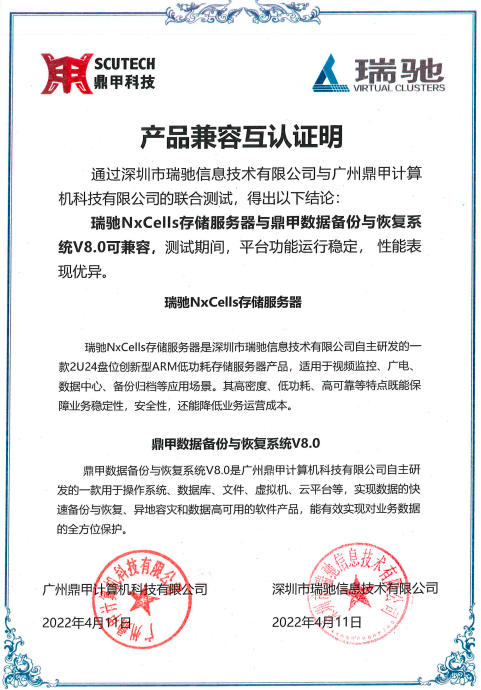 近日,鼎甲科技與瑞馳完成產(chǎn)品兼容互認(rèn)證。本次兼容性互認(rèn)證經(jīng)瑞馳與鼎甲科技雙方聯(lián)合測試得出:瑞馳NxCells存儲服務(wù)器與鼎甲數(shù)據(jù)備份與恢復(fù)系統(tǒng)V8.0可兼容,測試期間,平臺功能運(yùn)行穩(wěn)定,性能表現(xiàn)優(yōu)異。