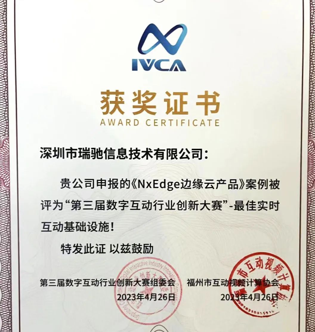 瑞馳榮獲數(shù)字互動(dòng)行業(yè)創(chuàng)新大賽登云獎(jiǎng) “最佳實(shí)時(shí)互動(dòng)基礎(chǔ)設(shè)施”獎(jiǎng)。