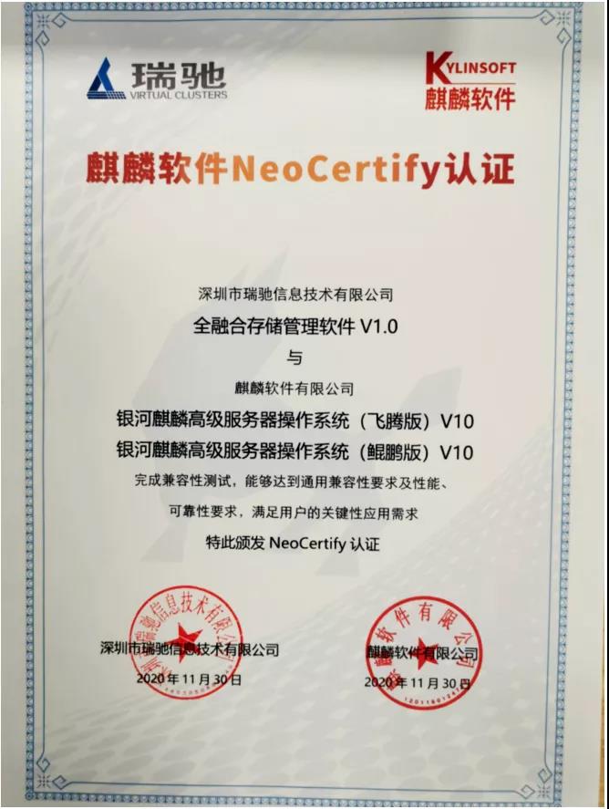 近日,瑞馳與麒麟軟件完成產(chǎn)品兼容性互認(rèn)證。經(jīng)測(cè)試,瑞馳全融合存儲(chǔ)管理軟件V1.0能夠在銀河麒麟高級(jí)服務(wù)器操作系統(tǒng)V10(飛騰版/鯤鵬版)上穩(wěn)定運(yùn)行,滿足通用兼容性要求及性能、可靠性要求,滿足用戶的關(guān)鍵性應(yīng)用需求。