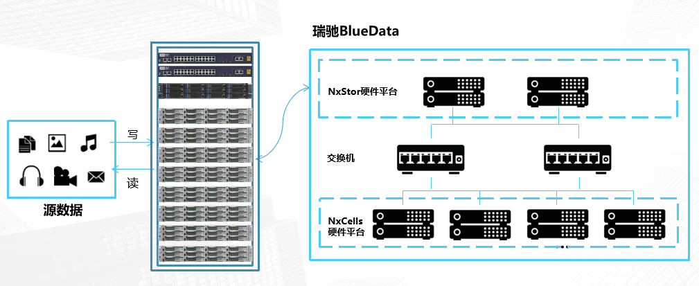 Bluedata海量冷數(shù)據(jù)存儲系統(tǒng),整體主要以NxStor高性能存儲節(jié)點及NxCells高密度低功耗存儲節(jié)點為基礎(chǔ)硬件平臺,通過BlueData智能存儲管理系統(tǒng)統(tǒng)一管理,目前這一產(chǎn)品主要應(yīng)用于視頻云存儲場景中。